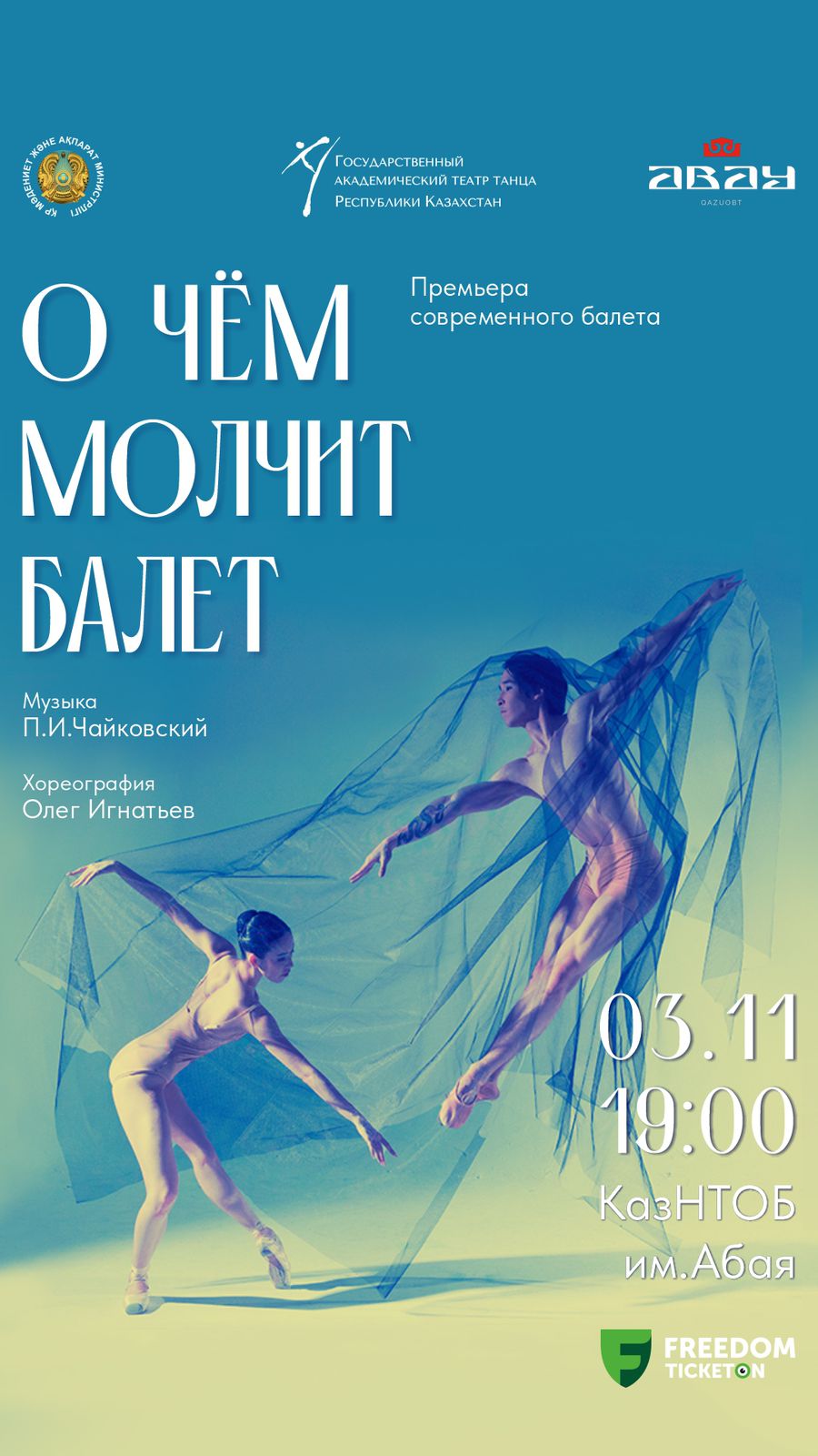 03 ноября Государственный академический театр танца Республики Казахстан представит Премьеру современного одноактного спектакля «О чем молчит балет» на музыку П.И. Чайковского в хореографии Олега Игнатьева. Балетное закулисье всегда окутано завесой тайны, что делает его манящим. Оно полно интриг, профессионального юмора и самобытности. Этот одноактный балет приоткроет глаза обычному зрителю на процессы происходящие внутри театрального организма, не только обличая, но и показывая все прелести.